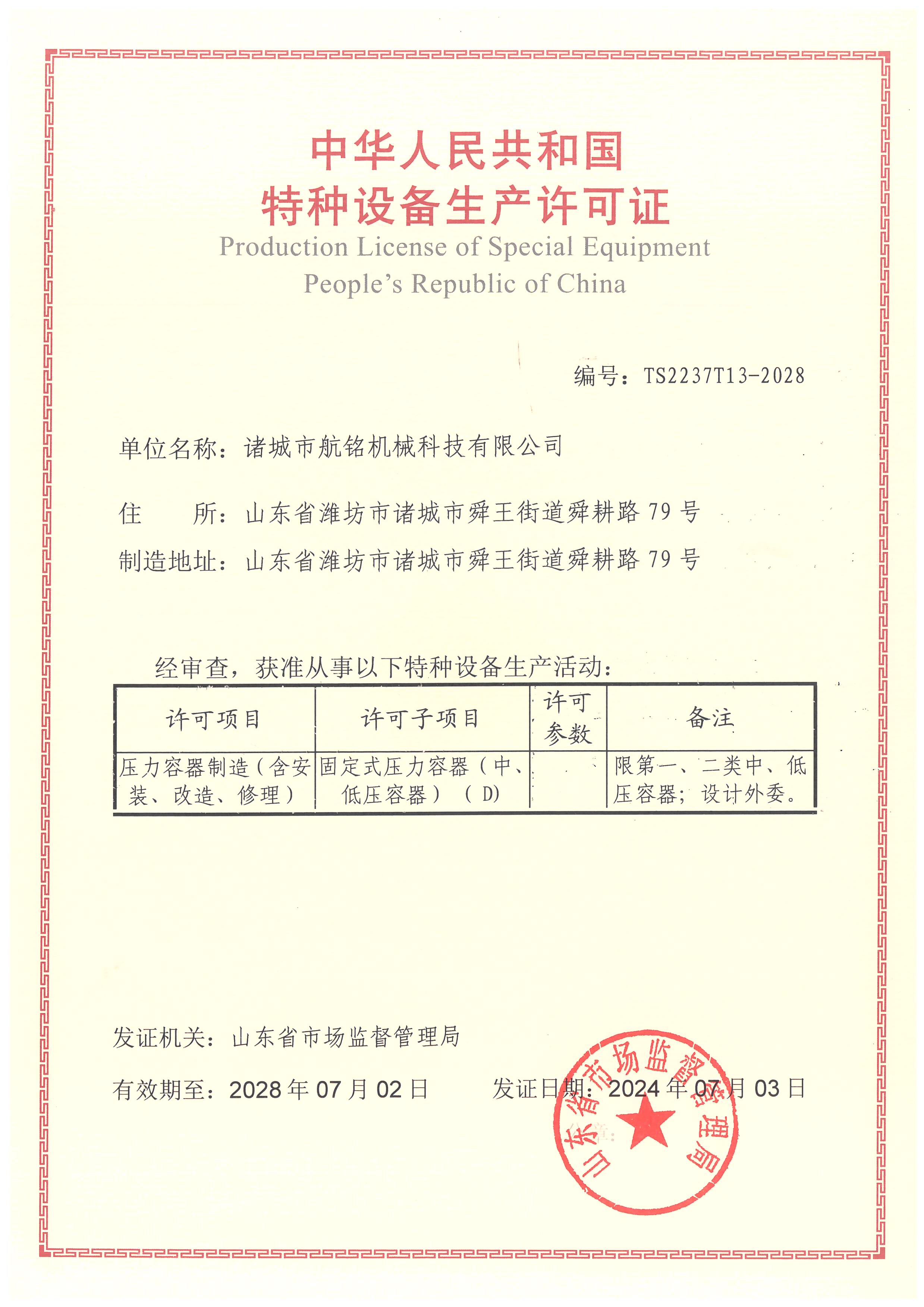 特种设备生产许可证